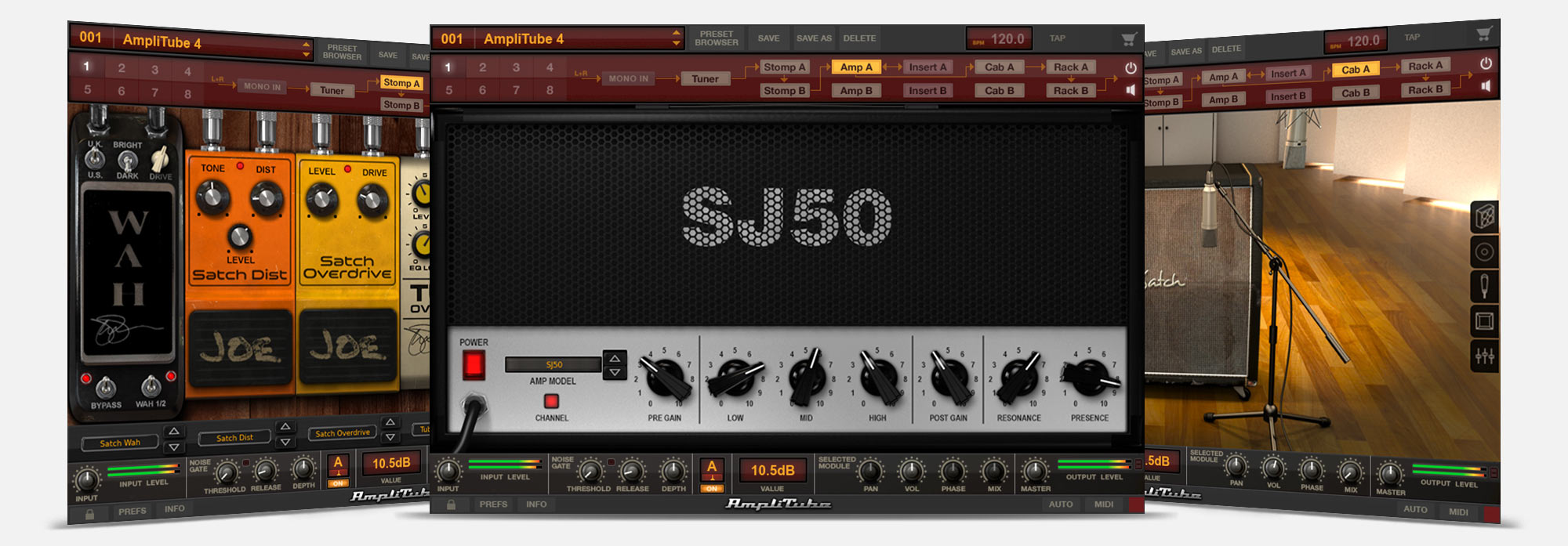 AmpliTube Custom Shopは無償のMac/PC用アンプ・シミュレーター・ソフトウェアです。デュアル・シグナル・チェーン、チューナー、ペダルボード、アンプ、キャビネット、マイク、ラック・エフェクト・セクションと24機種のギアを無料で組み合わせて使用することができます。Custom Shopは24時間365日営業のバーチャルな楽器店で、AmpliTube Joe Satrianiのギアを試奏し、1機種ごとの購入も可能です。