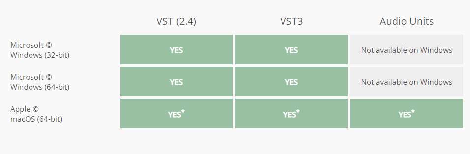 - macOS 64-bit : VST(2.4) , VST3 , AU