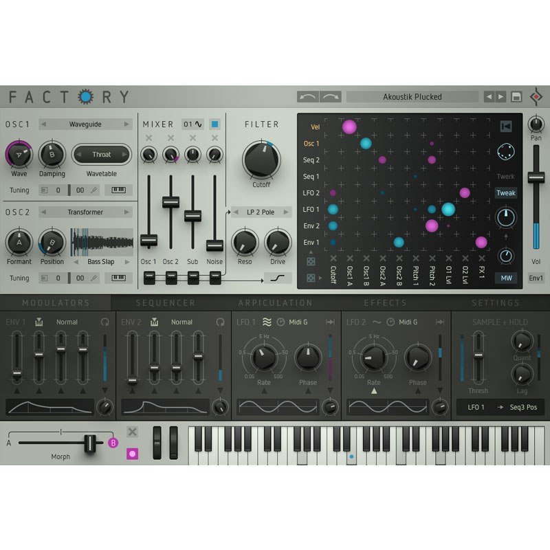 Soundbits: “About Factory I liked the most its very flexible and novel Modulation Matrix, the versatile Oscillators, the Morphing possibiltiy and the super slick GUI”