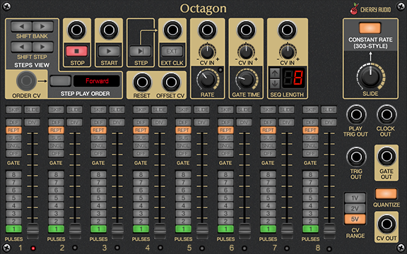 Octagonは、リズミカルに精巧なパターンやメロディーを超高速かつ簡単に作成できる強力なシーケンサーです。シーケンスは最大32ステップで、各ステップには最大8つのゲートパルスが含まれ、各シーケンスステップ内で拡張ノート値、レガートプレイ、リピート、またはユーザー定義パターン用の多数のモードがあります。各ステップには、ラチェット、スキップ、スライドコントロールも含まれます。Octagonの独自のスライド実装により、伝統的なスタイルのシンセポルタメントまたは303スタイルの一定レートのスライドが可能になります。