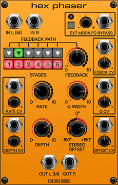 Hex Phaserは、モジュラーシンセサイザー用にこれまでに作成された中で最も強力で柔軟なステレオフェイザーです。他のフェイザーとは異なり、アクティブステージの数とフィードバックが導入されるステージは、フェージングカラーの巨大なパレットに合わせて簡単に構成できます。レート、深度、帯域幅、フィードバック量は完全に調整可能です。ユニークなステレオオフセットコントロールは、左チャンネルと右チャンネルのLFO間の位相関係を変更して、大規模なステレオフェージングエフェクトを実現します。