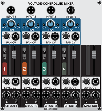 オーディオとコントロール信号用の4チャンネルミキサー。ソロとミュート、個別のステレオ出力、およびすべてのチャンネルのレベルとパンのフルボルテージコントロールを備えています。