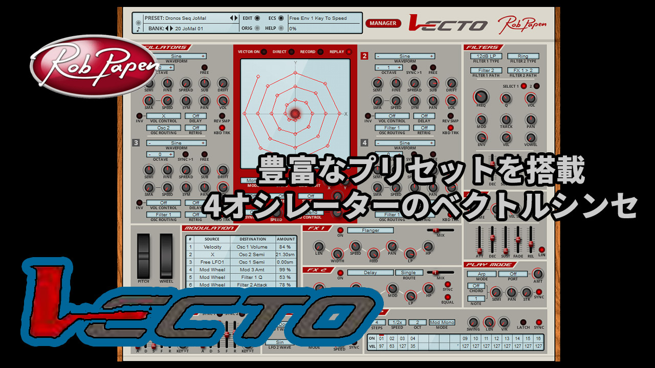 Vectoは、ベクトルパスを描くことで、キャラクターの異なるサウンドを生成することができる、4オシレーターのベクトルシンセサイザーです。オシレーター波形やサンプリング波形、モジュレーション・オプションなど、独自のサウンドを作成するために役立つ、プリセット・ベクトルパスを豊富に備えています。