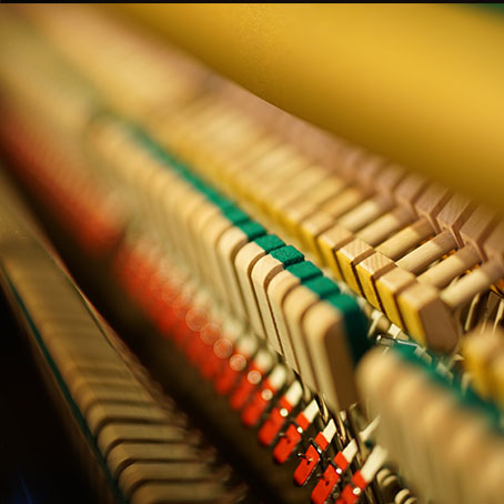 多くの過去のピアノは音色を変える機構を持っていました。一般的にはペダルまたは膝のレバーで行います。そして最も一般的でシンプルに音色を変える機構がハンマーと弦(ピアノ線)の間に何かを挟むことです。ハンマーの明るいアタックエッジを取り除き、響きを柔らかくすることが、この気候でよく用いられる手法です。この間に挟む物体の素材、サイズや位置などを調節することで、新たな表現や響きを得ることが可能です。