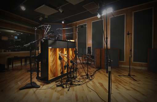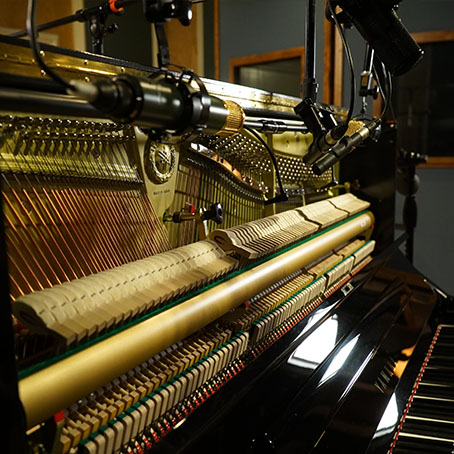 ルーム - Room C414:よく知られたラージダイアフラムのFETオムにマイクです。ピアノの後ろ、10フィートの距離に立てたマイクロフォンで、広い音像と温もりのある音色が特徴です。主に他のマイクロフォンの響きに厚みを加える際に使用しますが、ソロに使用できる明瞭さも残しています。どのマイクロフォンも響きの距離感を得つつも、距離補正によってミキシング時の位相問題を最小限に抑えています。