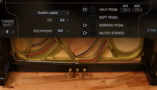 SordinoとMuted Strikesもペダル操作可能です。Sordinoは、MIDI CC#67でソフトペダルの替わりに使用できます。Muted Strikesもペダル操作可能です。通常ソステヌートの必要がない場合MIDI CC#66に割り当てると良いでしょう。ペダルやコントローラーが十分にあれば、5つ全てのペダルを同時操作することが出来ます。どのペダルも自由なMIDI CC割り当てが可能なので、モジュレーションホイール、スライダーやボタンなどで操作できます。そしてSordinoとMuted StrikesはSoloボタンの画面操作でも直接オンにできます。他のバーチャルピアノでは、ここまで自由にリアルタイム設定をする事は出来ません。すべての設定や操作はメイン画面で行え、3つの基本的なペダルは全てVI Labs独自のTrue Pedal Actionとサスティンペダル用にハーフペダルサンプルが採用されています。Sostenuto、SoftとSordinoペダルは、真ん中、もしくは左側に設置します。リペダルの動作は滑らかで、True Pedal Actionはハーフペダル機能と共に自然でリアルなダンパーペダル共鳴を実現します。