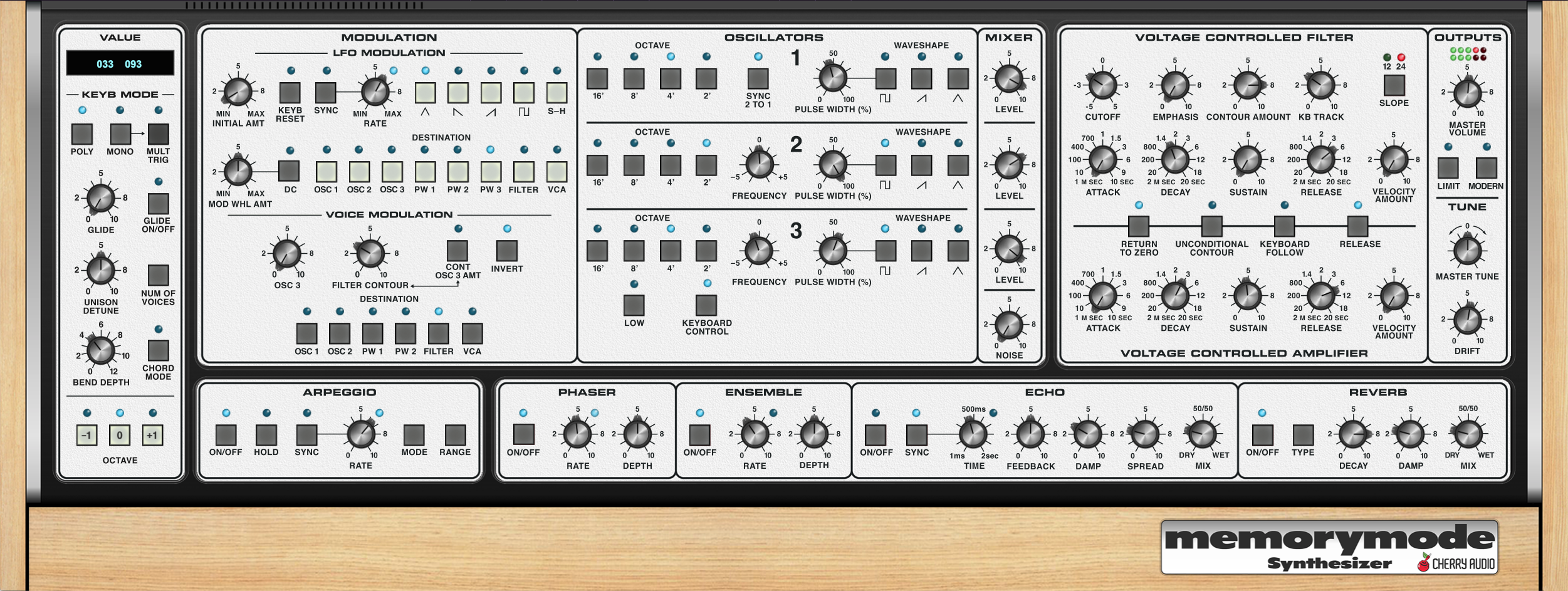 Memorymodeは、オリジナルの3オシレーター・ボイス・アーキテクチャーを超正確に再現し、憧れのラダー・フィルター回路を正確に実装することで、ワンツー・パンチの巨大なトーンを実現しています。さらに、Memorymodeのオシレーター・ミキサーは、オリジナルと同様に、レベルを上げると緩やかにオーバードライブします。