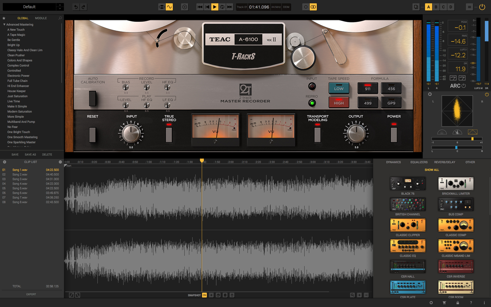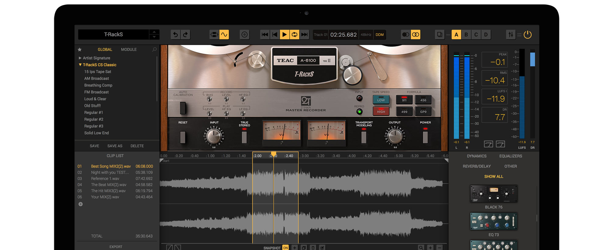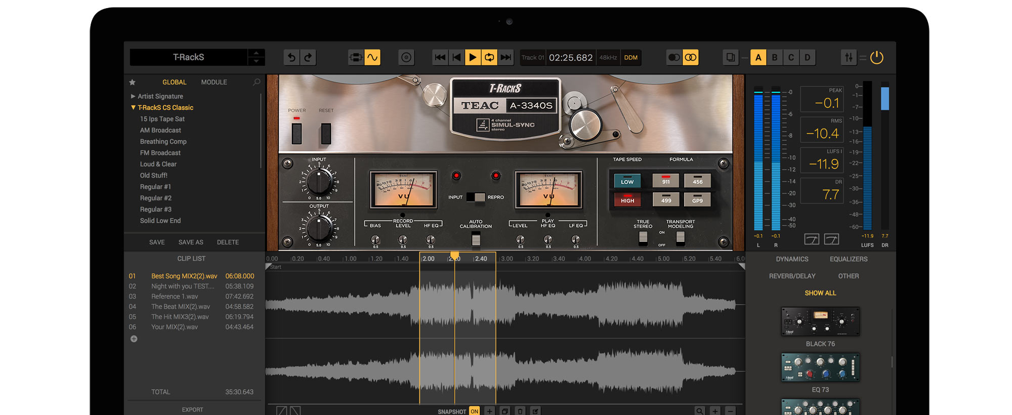 T-RackS TASCAM Tape Collectionの各モジュールは、AAX、VST2/3、Audio Unitsの単体プラグインとしてだけでなく、T-RackS 5 Suiteの一部としてご利用いただけます。T-RackS 5にはMac/PC版のスタンドアローン・アプリケーションもあり、48種類のT-RackSプロセッサーと合わせて使用することで、ミックスやマスタリングをよりスピーディーに行い、パワフルでスピーディーなワークフローを実現します。