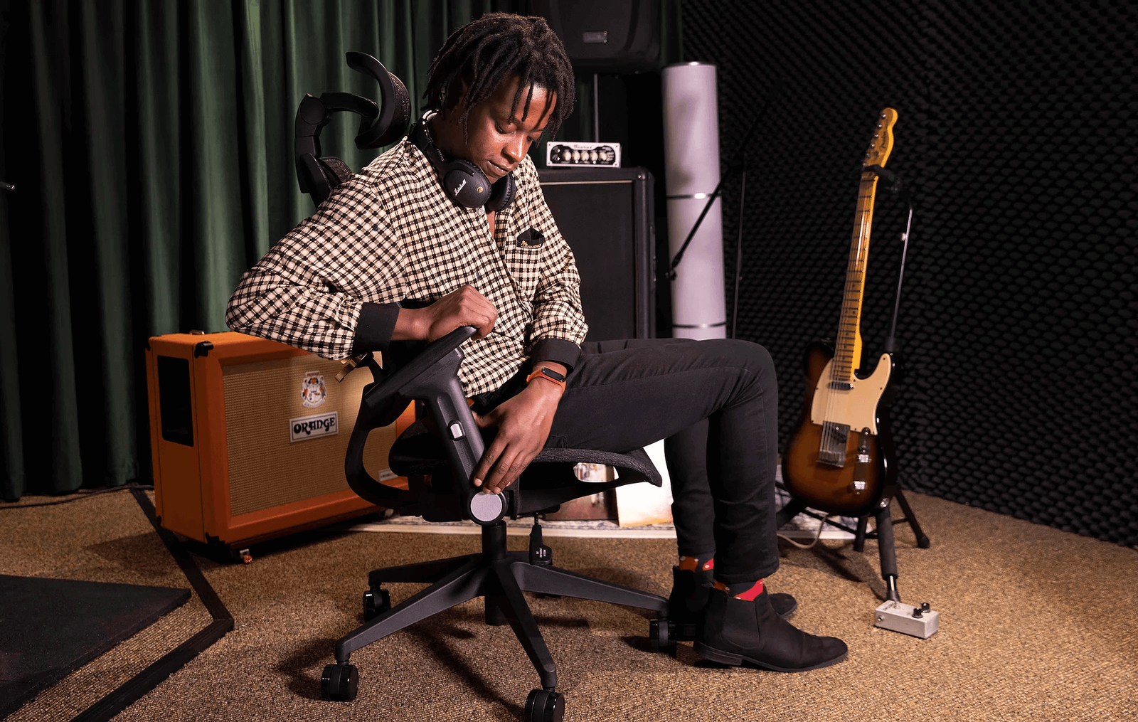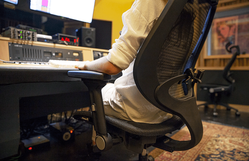 背中全体を支えるスタジオ・チェア 「 Voyager II 」 は座っている際の圧力を和らげるだけでなく、より柔軟な楽器演奏をサポートします。