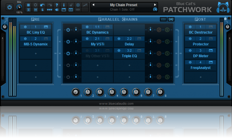 接続は直列でチェインを組む、あるいは最高8個のパラレルチェーンを作成でき、それぞれ独立して有効にできます。 複数のバスを使用せずにプラグイン内で好みのエフェクトやインストゥルメントを構成できます。
