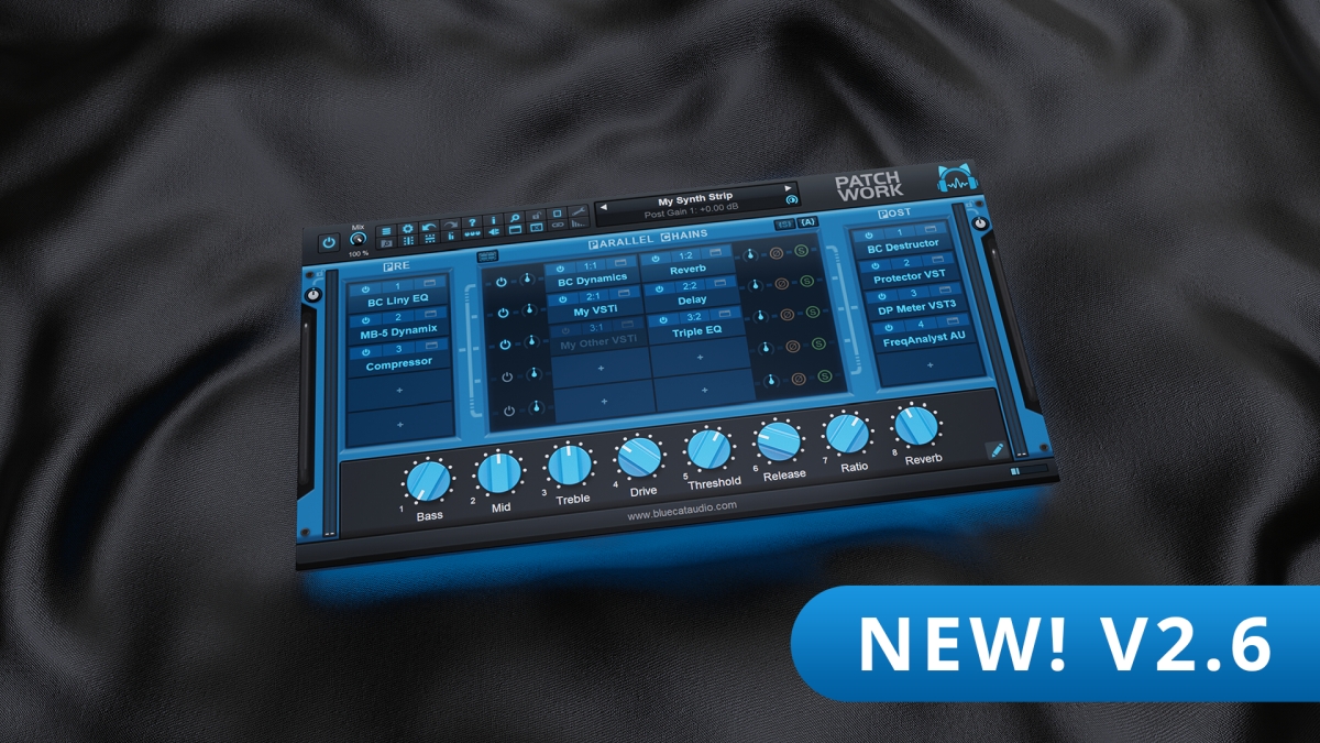Blue Cat's PatchWorkは、あらゆるデジタルオーディオワークステーションで、最高64のVSTプラグインをパッチングできるプラグイン・パッチベイです。