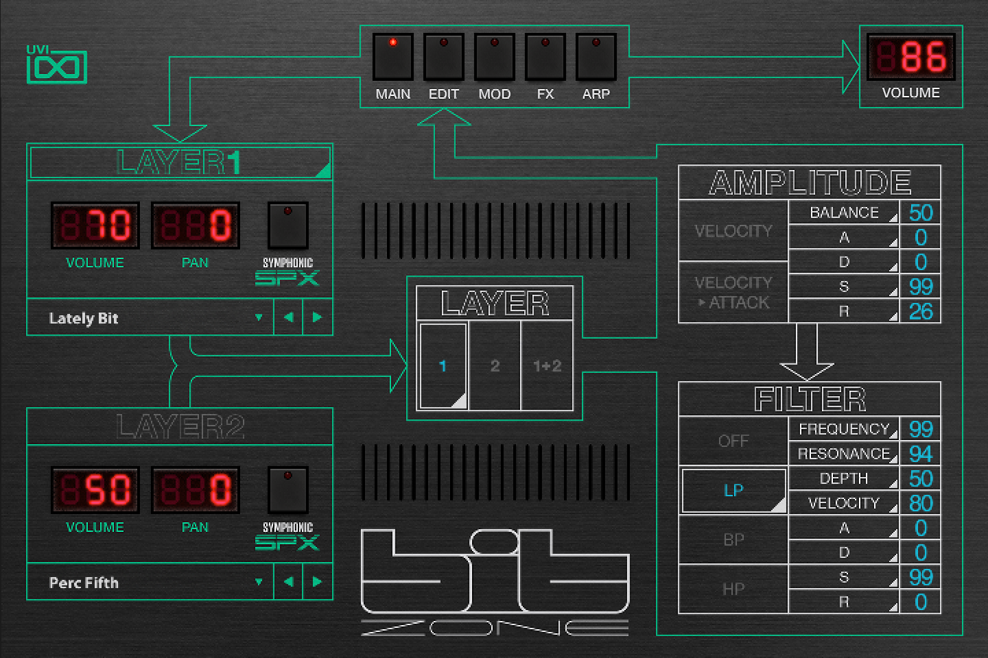 最終的にBit 99から 29,000を超えるサンプルを収録し、168レイヤーを組み、378プリセットとしてBit Zoneに封じ込み、アルペジオ、コードステップ、ワンフィンガーなどのアニメションサウンドをはじめ、ベース、ベル、ブラス、エフェクト、キーボード、リード、オルガン、パッド、プラック、ポリシンセ、ストリングスとウィンドにカテゴライズしました。Bit Zoneのどの音色も完全エディット可能で、すぐに使用することも、新しいサウンドの開始点として使用することもできることを念頭にプログラミングされています。そして、最初から音作りのためにBit 99の生粋波形も用意しました。Bit Zoneのデザイン美学は、実機の持つ特徴的な雰囲気を纏いつつ、完全独立した2つのレイヤー(つまり実機2台分)で扱えることです。オシレーターからエンベロープ、マルチモードフィルター、そして先進的なアルペジエーターまで、2つずつ用意されています。これに加え、共通のLFO、ステップモジュレーター、スタジオ品質の内蔵エフェクト:EQ、ドライブ、Thorus、アンサンブル、フェイザー、ディレイとSparkverbで、そのサウンドを仕上げます。