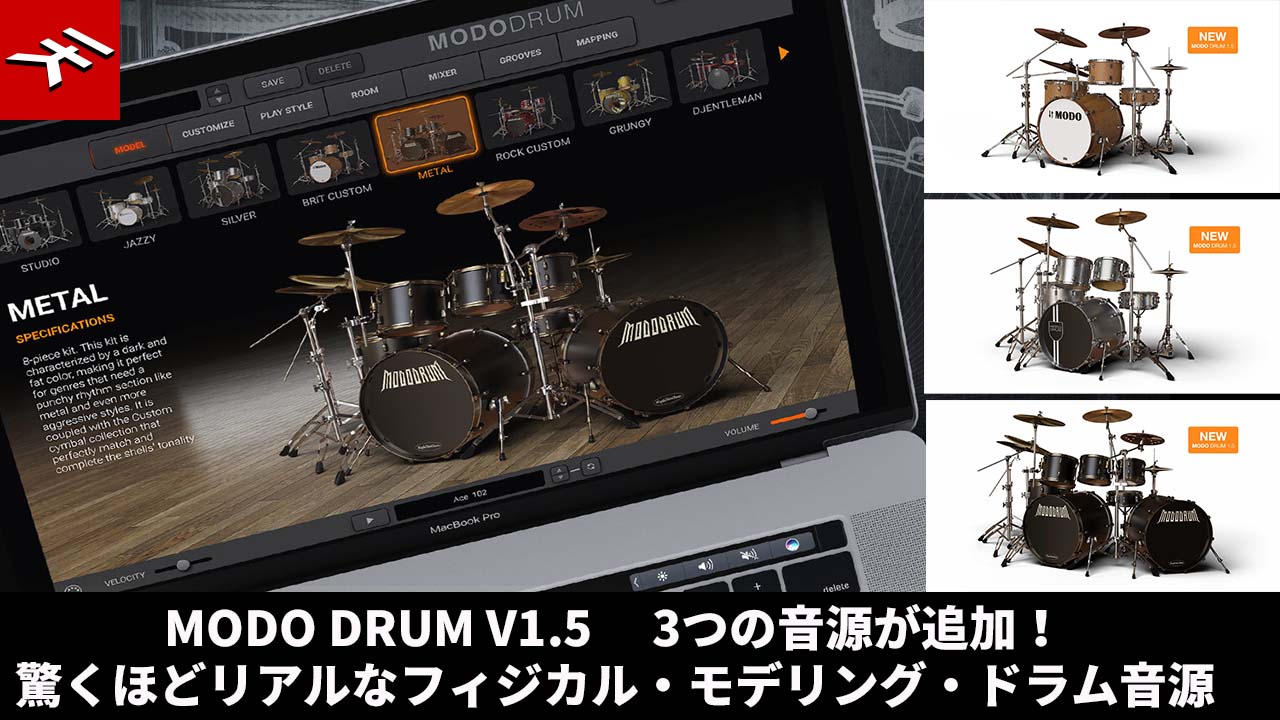MODO DRUM 1.5には、1960年代の有名バンドを彷彿とさせるキット、ジャズ向けのキット、ジョン・ボーナムがライブで使ったことで有名なキット、1980年台の多くの名盤で使われたバーチ材シェルのキットなど、従来の10種類のドラム・キットに加え、3つの新しいキットおよび対応シンバル・コレクションが追加されました。
