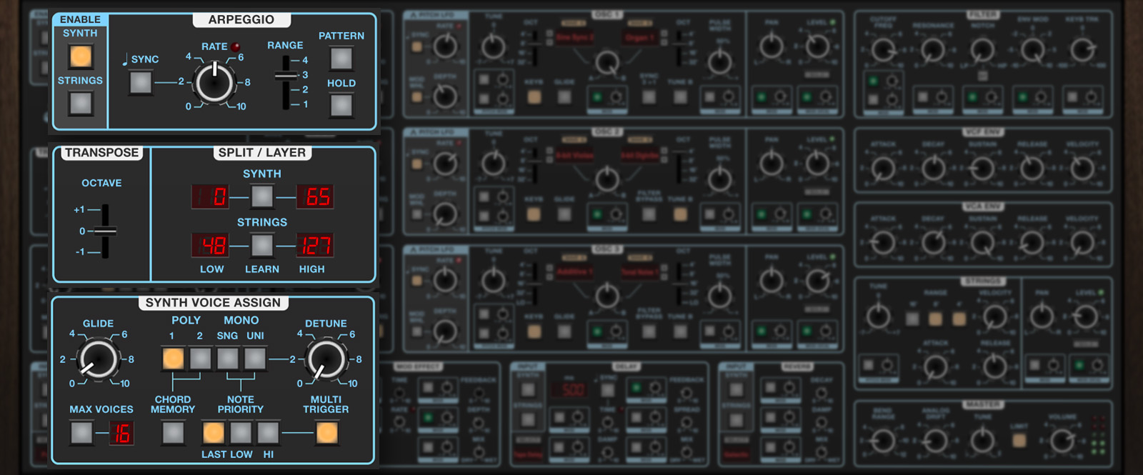 - 16ボイスのフル・ポリフォニック・ストリング・シンセサイザー(主シンセとは独立した鍵盤上でのレイヤーやスプリットが可能