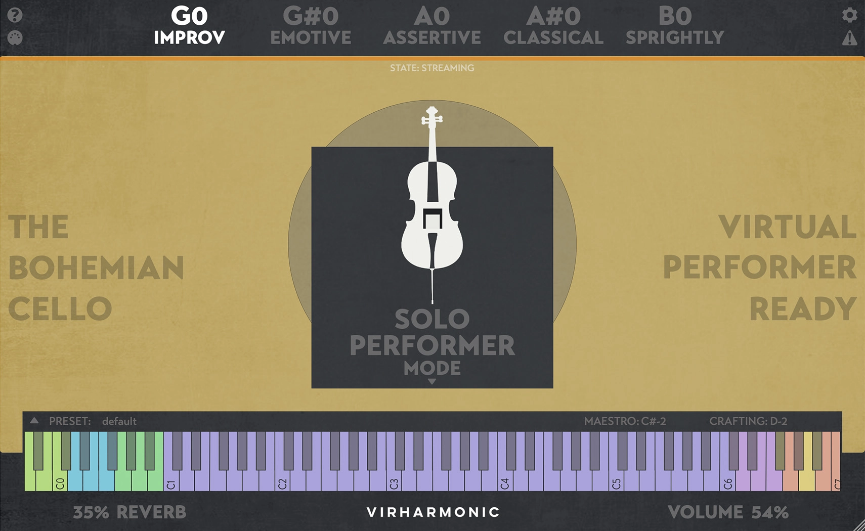 ムード・セレクション(インプロ、エモーティブ、アサーティブ、クラシック、スプライトリー)により、ヴァイオリニストの振る舞いを即座に変更することができます。