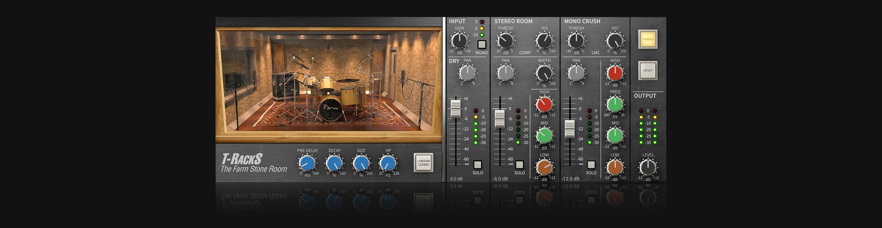The Farm Stone Room は、シングル・パネルのインターフェースを使用することにより、T-RackS を使ったことがなくても、直感的に操作できるレイアウトになっています。オリジナルの空間にいるような感覚で、音作りに集中することができるでしょう。