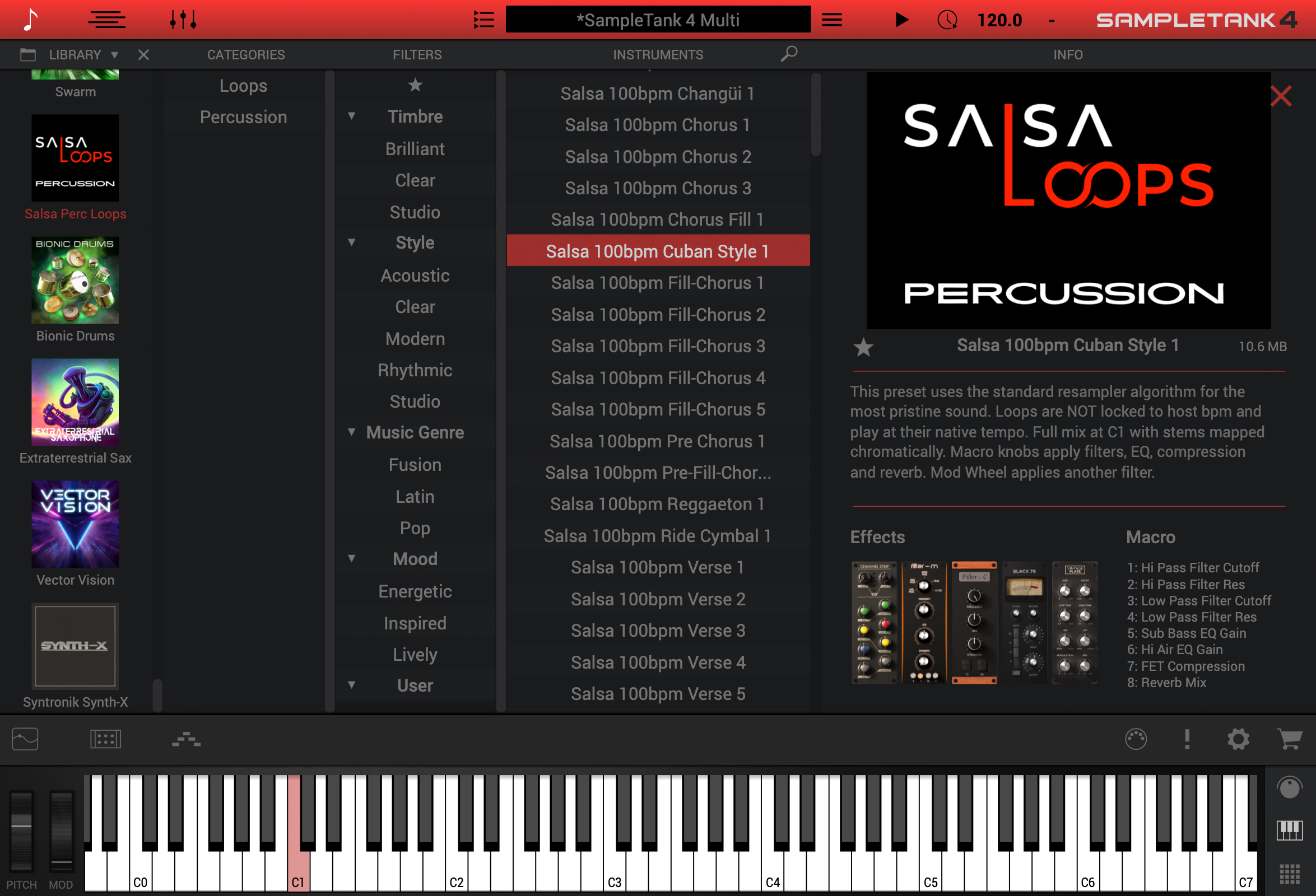 IK Multimedia(ソフトウェア) SampleTank 4 Salsa Percussion Loops 8,190円 税込 獲得予定ポイント:81 JAN: 4530027195237 在庫切れ あとで買う お問い合わせ インストゥルメント/Sampletankシリーズ 目次 概要 購入はこちら 概要 SampleTank 4拡張音源 ※ 無償の SampleTank 4 CSでも使用可能です! グラミー賞ノミネート・キューバ人プロデューサー Alex Rivas によるコンストラクション・キット仕様のサルサ・パーカッション・ライブラリーSampleTank 4音源「Salsa Percussion Loops」をリリースしました。キューバ出身のプロデューサー/ミュージシャンの Alex Rivas によって制作された Salsa Percussion Loops は、本場のミュージシャンによるサルサのマルチ・トラック・オーディオ・ループ、楽器を多数収録した即戦力のライブラリーです。Salsa Percussion Loops は、SampleTank 4(無料のCS版を含む)音源として、Mac/PCスタンドアローンおよびAAX、AU、VST 2/3プラグインにてお使いいただけます。## 本場のサウンドとリズムをSalsa Percussion Loops は、サルサのアレンジに最適な即戦力のライブラリーです。ティンバレス、コンガ、キックとスネア付きのティンバレス、ボンゴ、ハンド・ベル、ギロなど、サルサに必要なすべてのリズム楽器が収録されています。すぐに使える、イントロ、バース、カスカラ、フィル、コーラス、プリ・コーラス、チャチャ、キューバ風ボンバのリズムがあなたを待っています。Salsa Percussion Loops には、59 種類ものパーカッション音色を含む 「Salsa Percussion Kit」プリセットも含まれており、自由に演奏したり、独自のラテン・パーカッション・トラックを構築することができます。音色容量は1.39 GB、プリセット総数は155 種類におよびます。## 本物のサルサ・ライブラリーライブラリーの製作者である Alex Rivas は、Salsa Percussion Loops について次のように語っています。「私は、本物のサルサ・サウンドのライブラリーを見つけるのに何年も費やしてきました。最終的には、現代のサルサ・アーティストからインスピレーションを受けた、Salsa Percussion Loops を作ることを決めました。このプロジェクトを実現するために、ミュージシャン、楽器、機材を慎重に選定し、本物のサルサ・サウンドを目指したのです。このライブラリーを使えば、あなたも、本物のサルサソングを作ることができるでしょう」。## 本場のサルサ・プレイヤーによるサウンドSalsa Percussion Loops は、本場のサウンドであることを重要視しています。収録に参加したミュージシャンは、キューバ、ベネズエラ、コロンビアの出身者。これらの国に共通しているのは、サルサの音楽が彼らの生活の中に根付いているということです。 Alex Rivas とそのチームは、サルサの楽曲の中でも特に汎用的なリズムの演奏を録音し、さまざまな楽曲で使用できるようなライブラリーを構築しました。トラディショナルなグルーヴを知る、キューバ出身の Alex Rivas ならではサウンドを感じてください。## 最高のツールで収録されたライブラリーSalsa Percussion Loops は、Neve、API、Avalon、Universal Audio、AKG、Mojaveなど、高品位なスタジオ機材を使用して慎重に 24 bit レコーディングされています。ループは異なる3種類のBPM(95、100、105)にて収録され、SampleTank 4をプラグインとして使用している際には、DAWのテンポに同期します。SampleTank 4の強力なサウンド・エンジンにより、豊富なプリセットのバリエーションを実現しています。## SampleTank 4 に最適化Salsa Percussion Loops は、SampleTank 4 に最適化されており、パートごとに強力なサウンド・エンジンによるトーン・シェイプ、T-RackS、AmpliTube、Syntronik 譲りのSampleTank 4 内蔵エフェクトが利用できます。フィルター、EQ、コンプレッサーなど主なコントロールは、パネル上の「Macro」コントロールで即座に調整でき、モジュレーション・ホイールには、レゾナント・ローパス・フィルターがアサインされていますので、リアルタイムのパフォーマンスにも対応します。