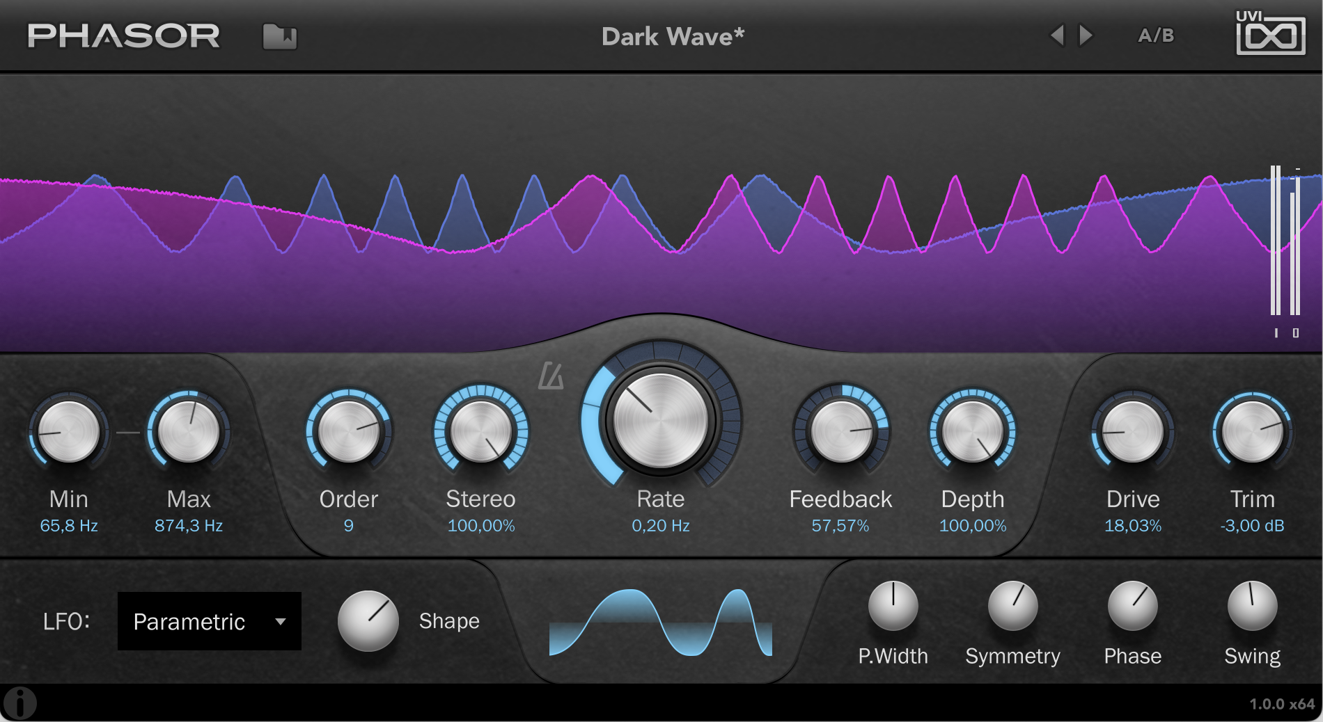 Phasorは強⼒でダイナミックなスタジオツールで、独⾃のマルチモードデザインと深い構成を可能にしたパラメトリックLFOによって、モジュレーション、フィルター、歪み効果の幅広いパレットを提供します。味わい深いステレオ⾳像の強化から、⾃由⾃在に変形できるLFO波形とスイングによるリズミカルなソニックサプリメント、最⼩と最⼤の周波数範囲設定、フィードバック、ドライブを活⽤したよりクリエイティブな効果まで、Phasorはこれまでのフェイザー効果の枠にとらわれない新たな体験をもたらします。