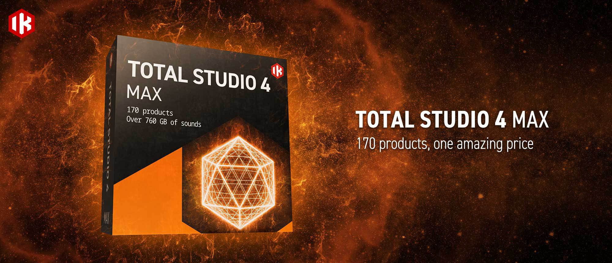 Total Studio 4 MAX は、IK Multimediaソフトウェア・スイートの最上位版です。バージョン4では、TONEX MAX、MODO BASS 2、MODO DRUM 1.5、AmpliTube MESA/Boogie 2、T-RackS モジュール2種類(The Farm Stone RoomとJoe Chiccarelli Vocal Strip)、SampleTank 4 用拡張音源12種類とSyntronik 2シンセ12種類が新たに追加されています。