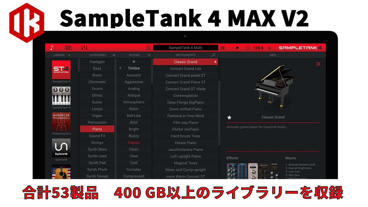 すべてのミュージシャン必携のワークステーション、SampleTankシリーズがSampleTank 4に生まれ変わりました。リサイズ可能な新しいインターフェース、さらに強化された膨大なサウンド・ライブラリー、最先端のサウンド・エンジンにより、あなたの想像を遥かに超えるパワフルな楽曲制作ツールへと進化したのです。SampleTank 4は、高品位なサウンド・ライブラリーだけでなく、70種類の内部エフェクトを搭載しており、インスピレーションを損なうことなす。