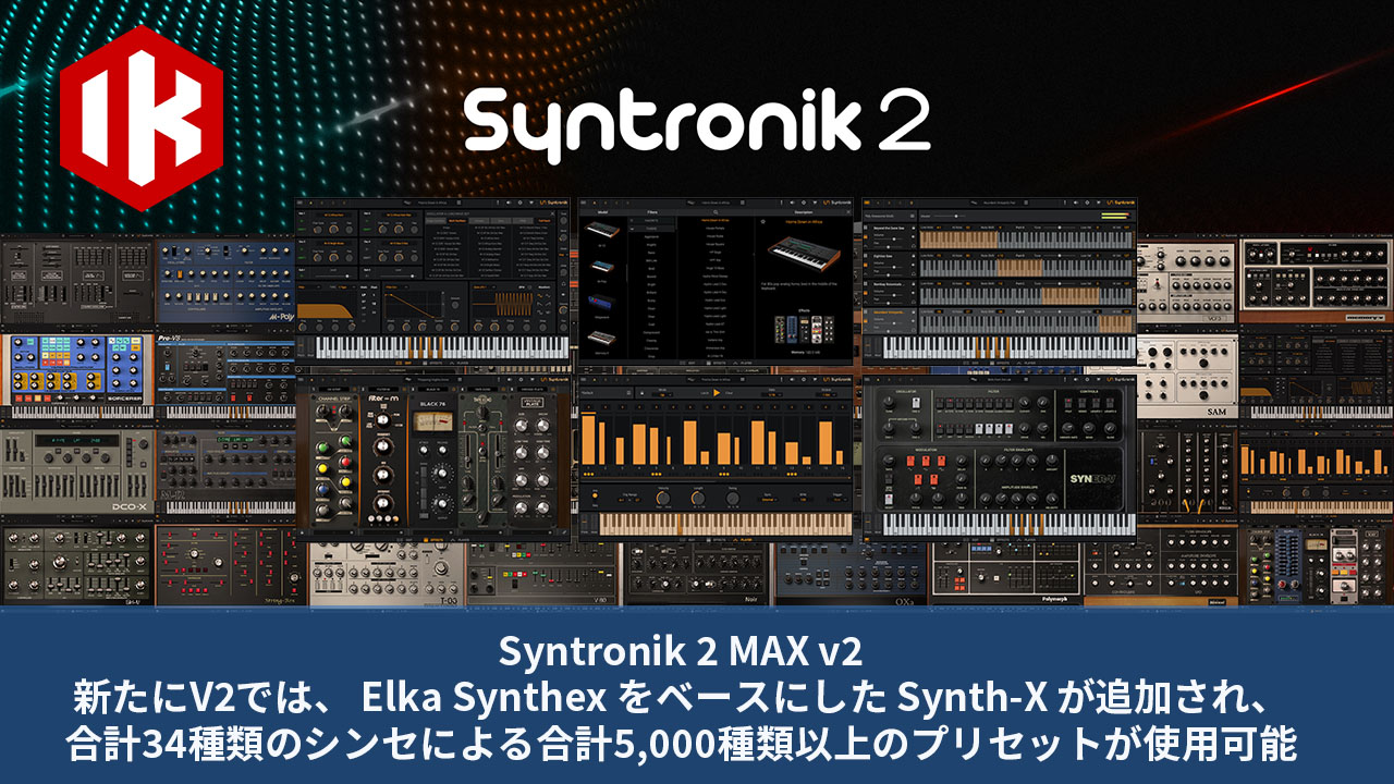 Syntronik 2 MAX v2 は、先進のサンプリング技術と、IKならではのモデリング技術に基づくシンセサイザー・エンジンを組み合わせたハイブリッド・タイプのバーチャル・インストゥルメントです。v2では、新たに Elka Synthex をベースにした Synth-X が追加され、合計34種類のシンセによる合計5,000種類以上のプリセットがご利用いただけるようになりました。