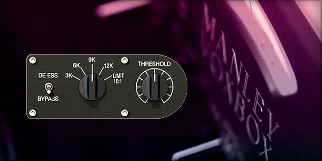 マンリーVOXBOXの中心部分には、驚くほど自然な響きを実現したディエッサーが存在します。2つのノブを使用すると、ボーカルだけでなく、甲高いエレキギターや明るすぎるオーバーヘッドを完全に制御できます。ディエッサー周波数コントロールをオフにして、このセクションをアグレッシブでカラフルなリミッターとして使用することも可能です。