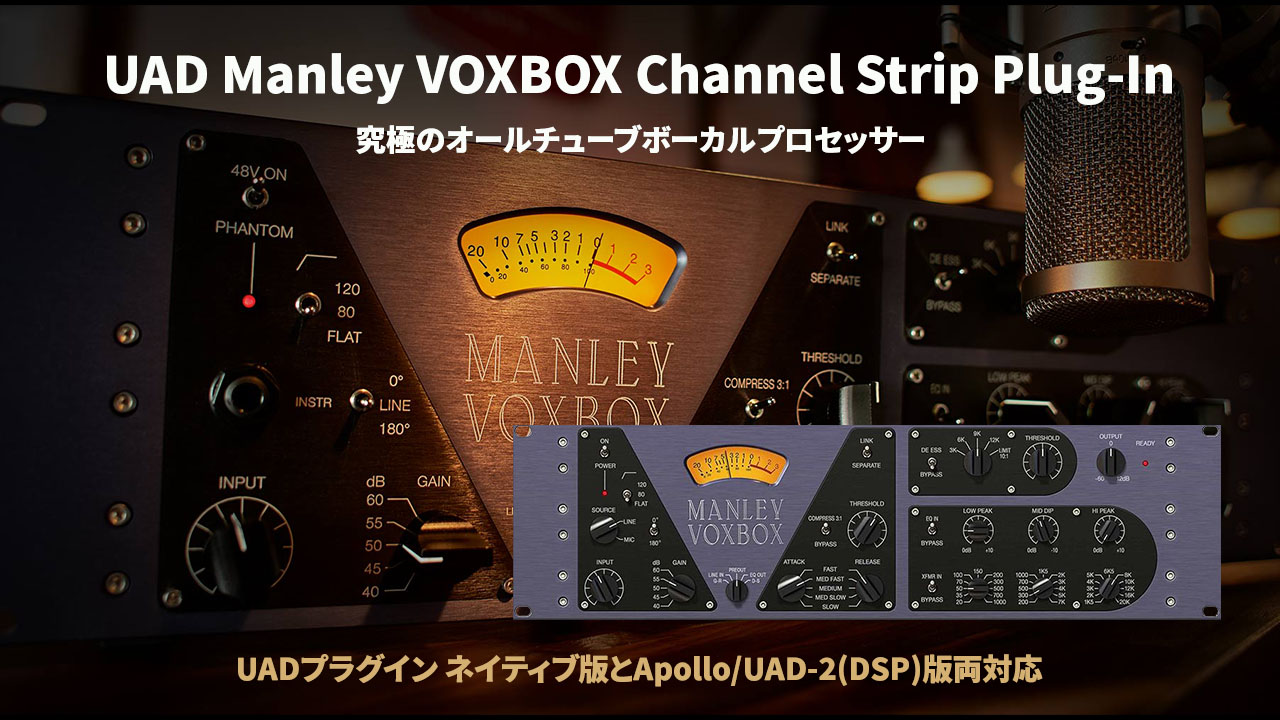 ManleyのVOXBOX Channel Stripは、チューブ駆動のプリアンプ、ダイナミクス、およびEQ回路からなる美しいシステムで、全ての重要度の高いボーカルソース向けに特化され設計されています。 Manley VOXBOX Channel Stripプラグインは、このプレミアムボーカルチャンネルストリップと同じ高音質でスムーズなサウンドを提供します。