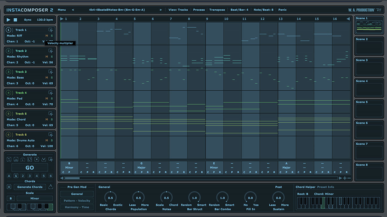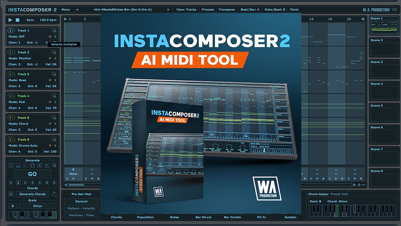 6 つのトラックと 8 つのシーンが利用可能な Instacomposer 2 は、単一のプリセット内で複数のレイヤー、代替バリエーション、さまざまな曲の部分を柔軟に構成できます。