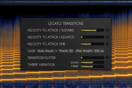 これらのトランジションは、電光石火のように速い変化から、極端に遅いベンドまで、余分なアタックの有無にかかわらず、多岐にわたります。私たちはこのすべてをカバーするようにしましたし、インターフェイスですべてコントロールできることがおわかりいただけるでしょう。レガートの動作はランダム化することもでき、より人間らしい演奏を実現します。