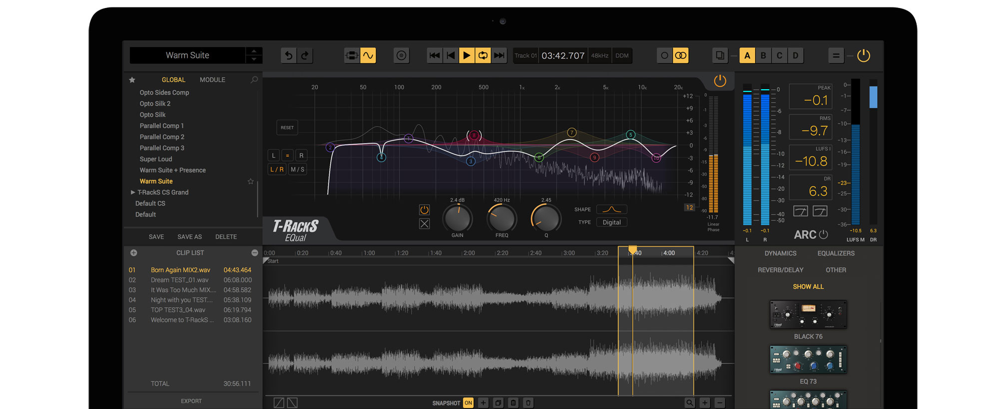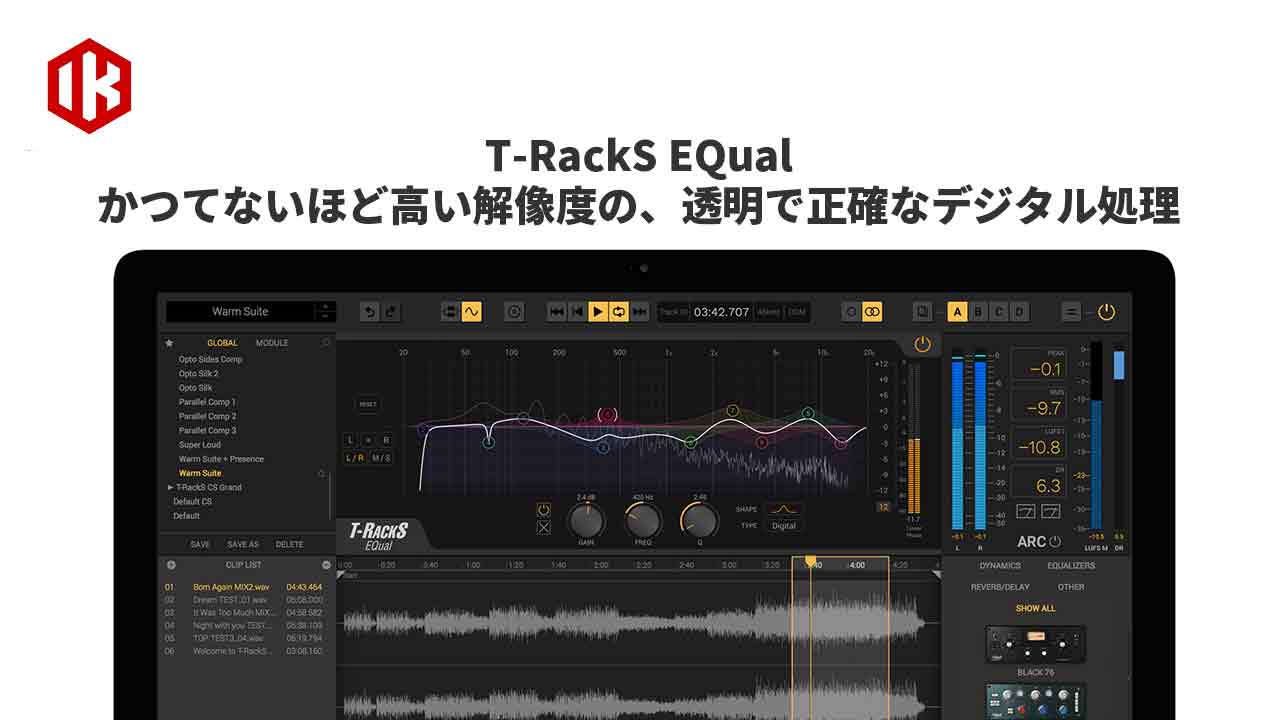 T-RackS EQual Digital Equalizerは、10バンドのパラメトリック・イコライザーです。かつてないほど高い解像度の、透明で正確なデジタル処理を基本としながら、Neve、SSL、APIなどアナログEQ名機をモデルにしたフィルター・カーブも呼び出せる「ハイブリッド・モンスター」となっています。
