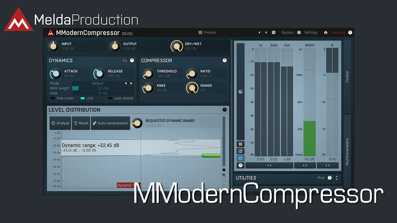 MModernCompressor は、RMS 長、ルックアヘッド、フル機能の 6 バンド イコライザー フィルタリング、心理音響プレフィルタリング、スペクトル スムージングなどの多彩なエンベロープ フォロワー機能によってこのパワーを実現しています。