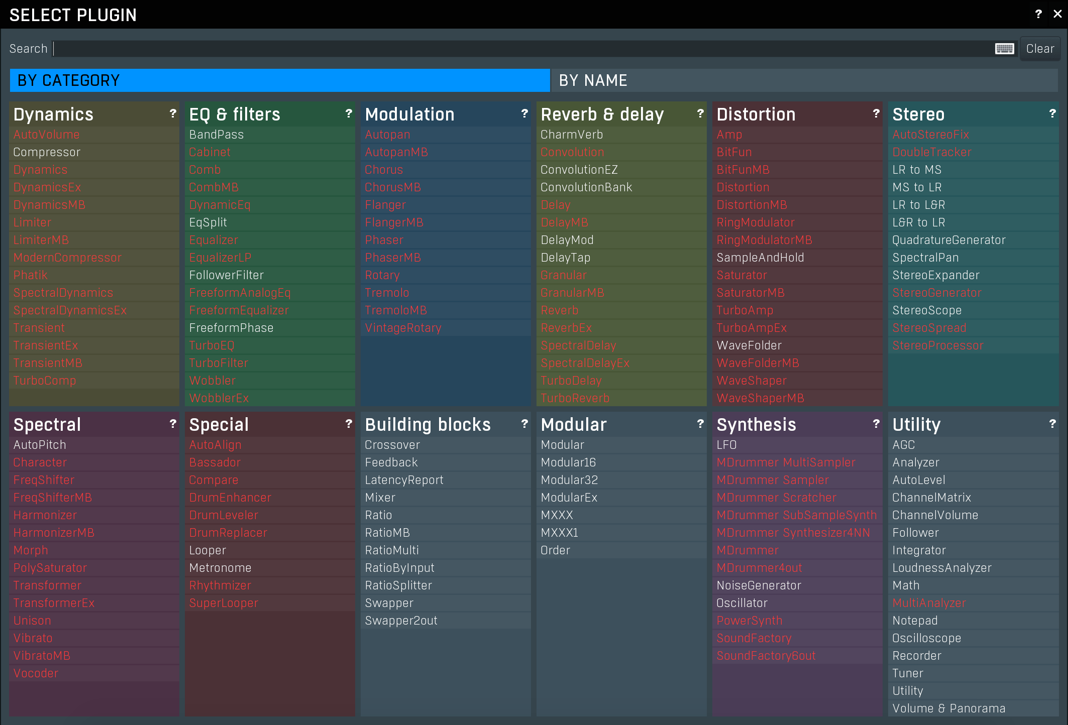 | Reverb & delay | Convolution Delay Granular Reverb Rhythmizer SpectralDelay TurboDelay TurboReverb | MConvolutionMB MDelayMB MGranularMB MReverb, MReverbMB MRhythmizer, MRhythmizerMB MSpectralDelay MTurboDelay MTurboReverb, MTurboReverbLE |