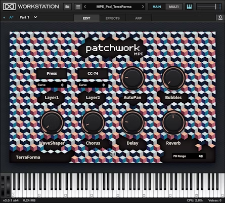 Patchwork MPEはMPEインストゥルメントのためにゼロから作られました。そのインターフェースにより、パラメーターのマッピング、各ムーブメントのコントロール感度の調整、選択したサウンド特性の変更を、数回のクリックで簡単に行うことができます。