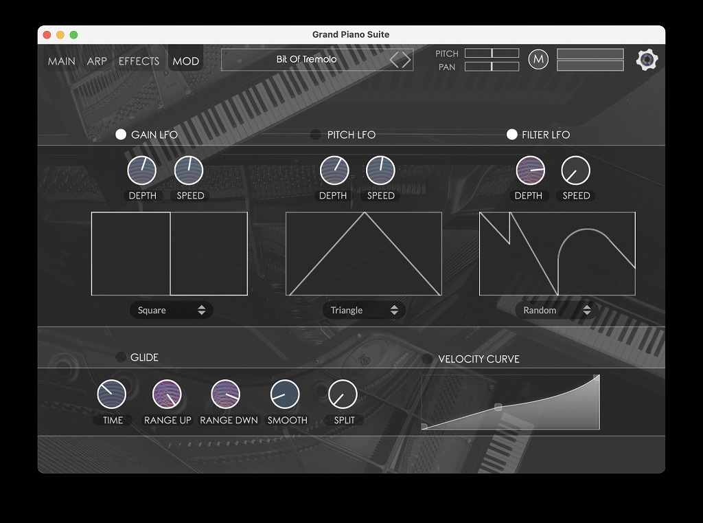 - 6 つの形状オプションを備えた 3 つの LFO (ゲイン LFO、ピッチ LFO、フィルター LFO)