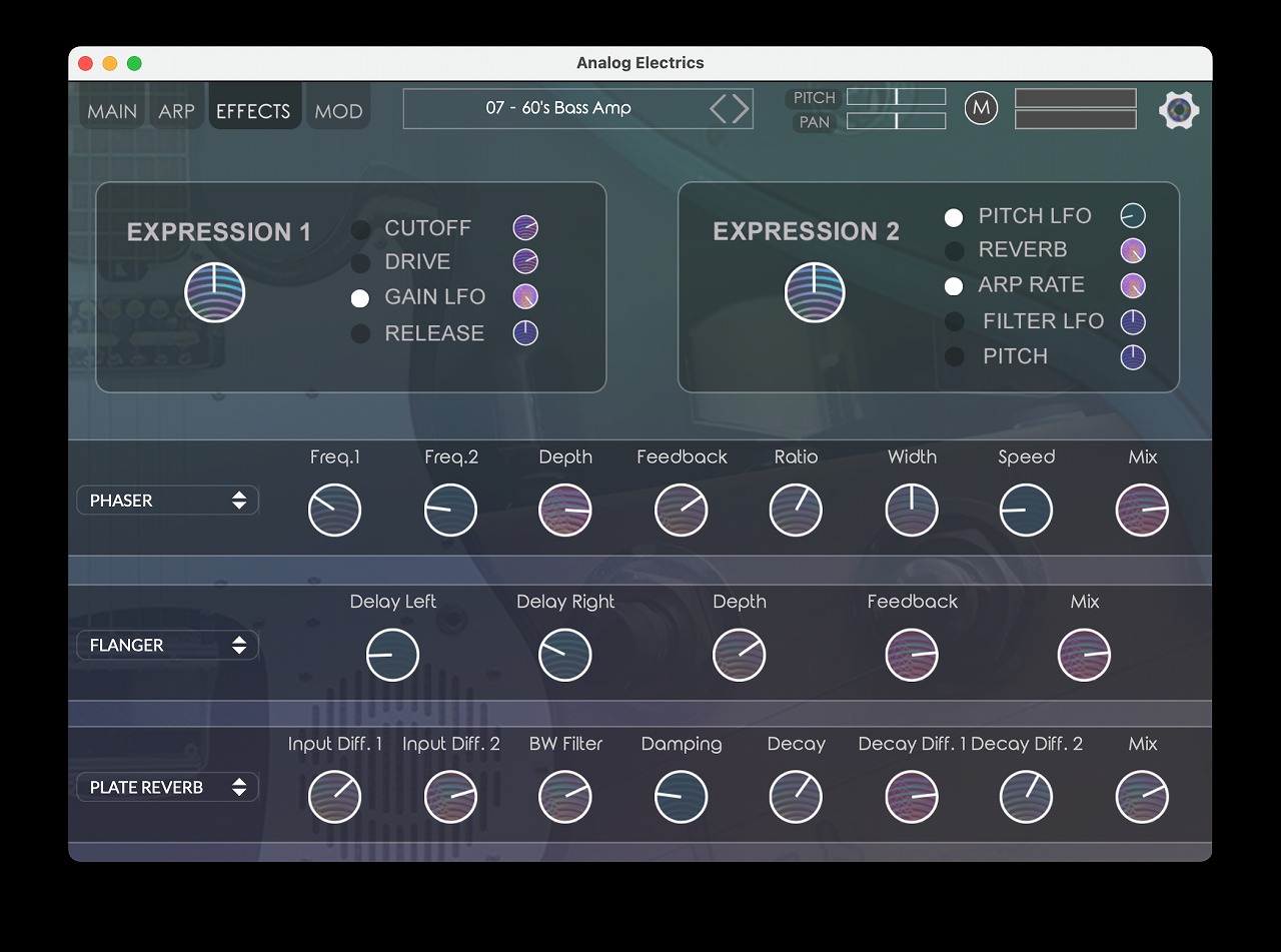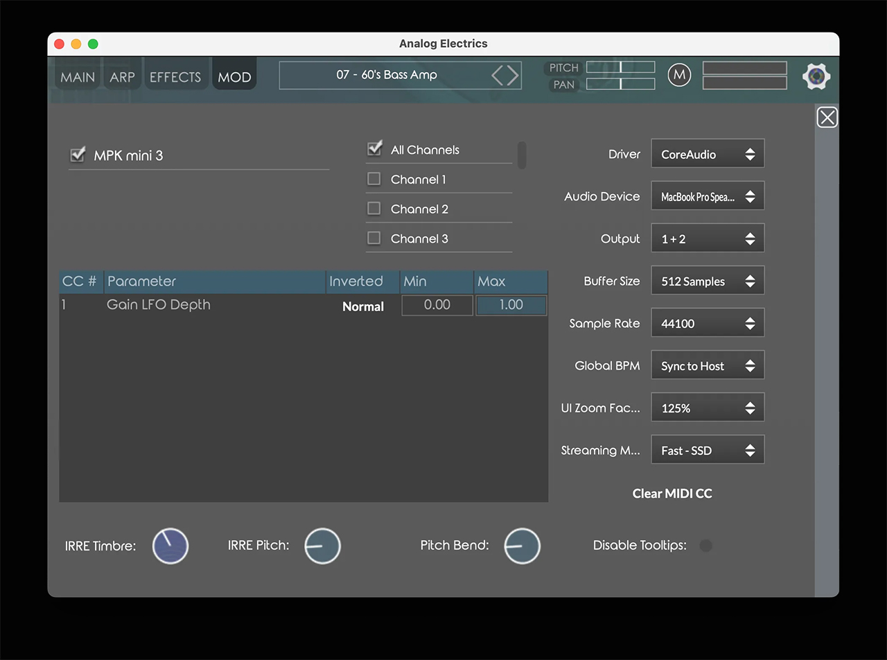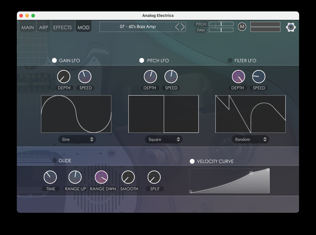 - 6 つの形状オプションを備えた 3 つの LFO (ゲイン LFO、ピッチ LFO、フィルター LFO)
