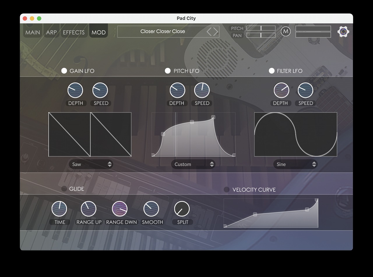 - 6 つの形状オプションを備えた 3 つの LFO (ゲイン LFO、ピッチ LFO、フィルター LFO)