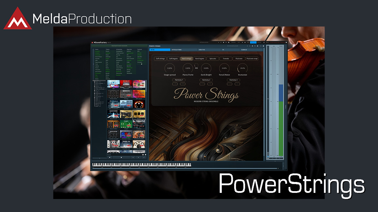 PowerStrings は、現代のポップスや映画制作のペースの速い要求に合わせて特別にチューニングされた MSoundFactory インストゥルメントです。