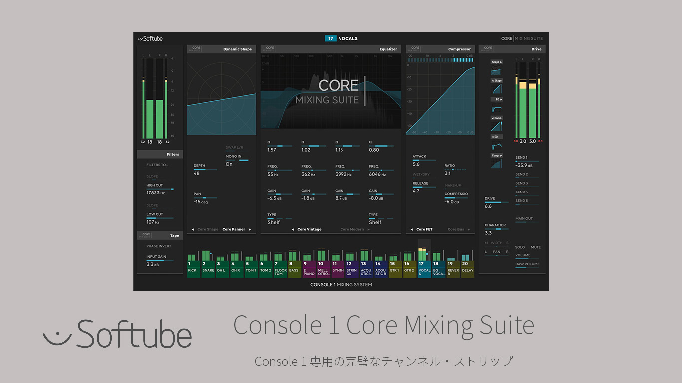 皆様からのフィードバックと Softube チームの技術の結晶である Core Mixing Suite は、まさに理想のチャンネル・ストリップです。