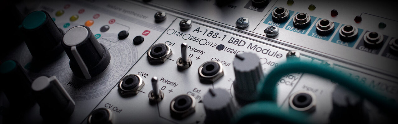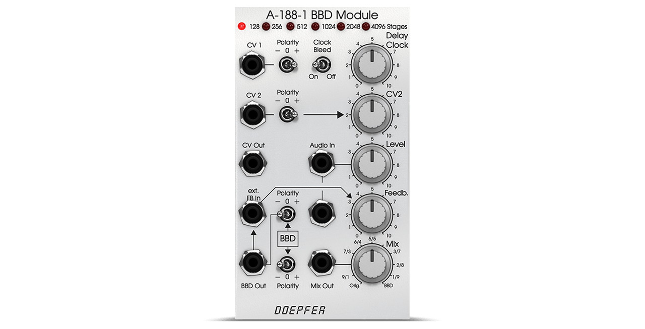 ディレイ・ラインの長さ、つまりバケツの数は、エフェクトのサウンドと機能に大きく影響します。ハードウェア・モジュールには、ステージの数が異なる6つのバージョン(128、256、512、1024、2048、4096)があります。一方、Doepfer A-188-1 BBDアドオンには6つすべてのバージョンが含まれており、1回のクリックでバージョンを切り替えることができます。