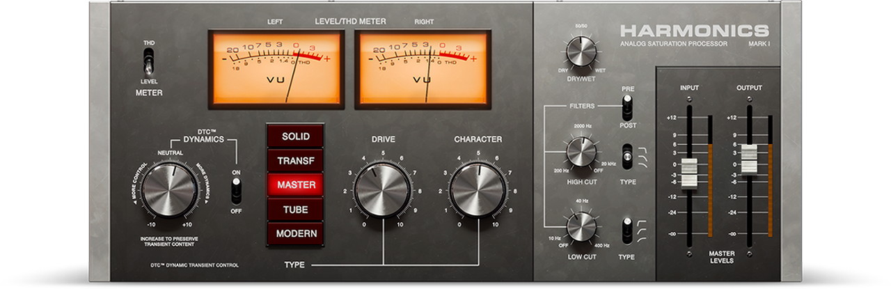Harmonicsには、素晴らしいサウンドの5つのアナログ・ディストーション・モデル(という説明では追い付かないほどの可能性があります)が用意されています。また、サウンドを歪ませている最中にダイナミクスをコントロールするという革新的なアプローチが採られています。