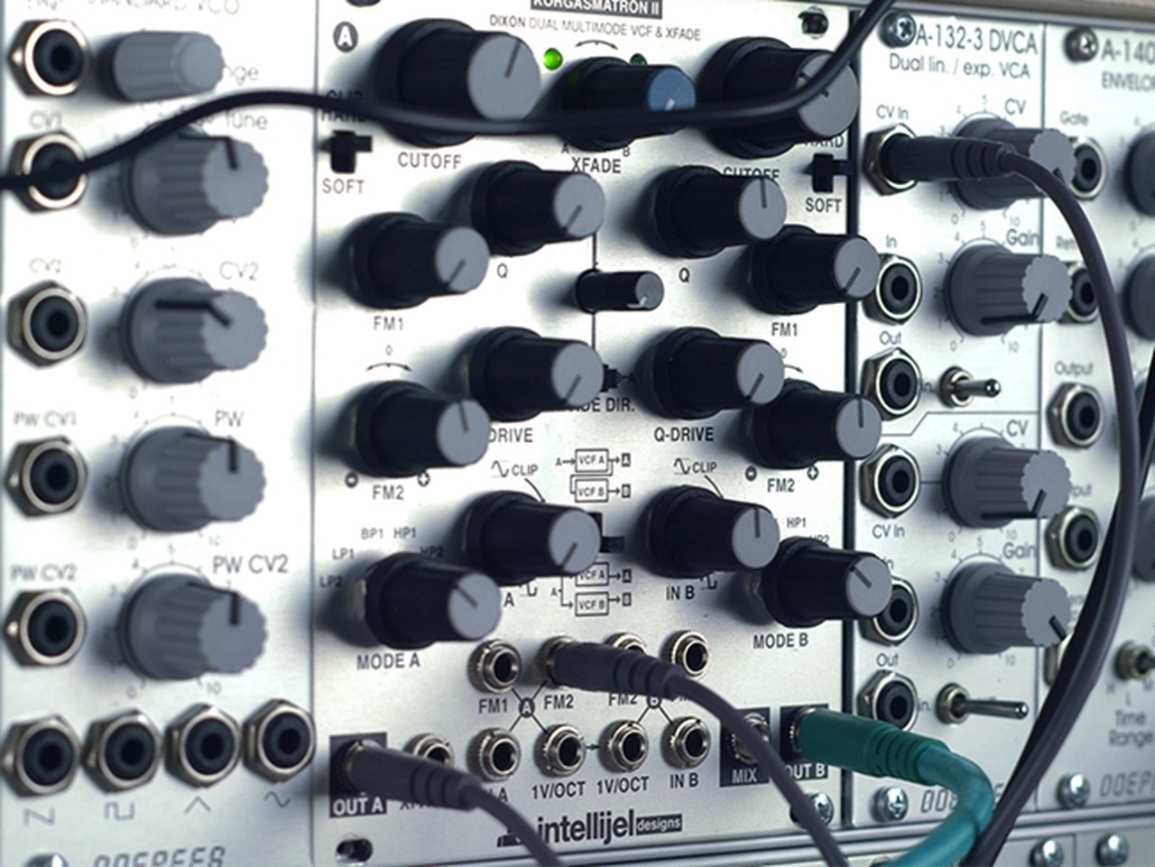 Intellijel Korgasmatron IIは、完全に独立した6モードのフィルター出力がA/Bに用意されており、これらはロータリー・スイッチで選択します。