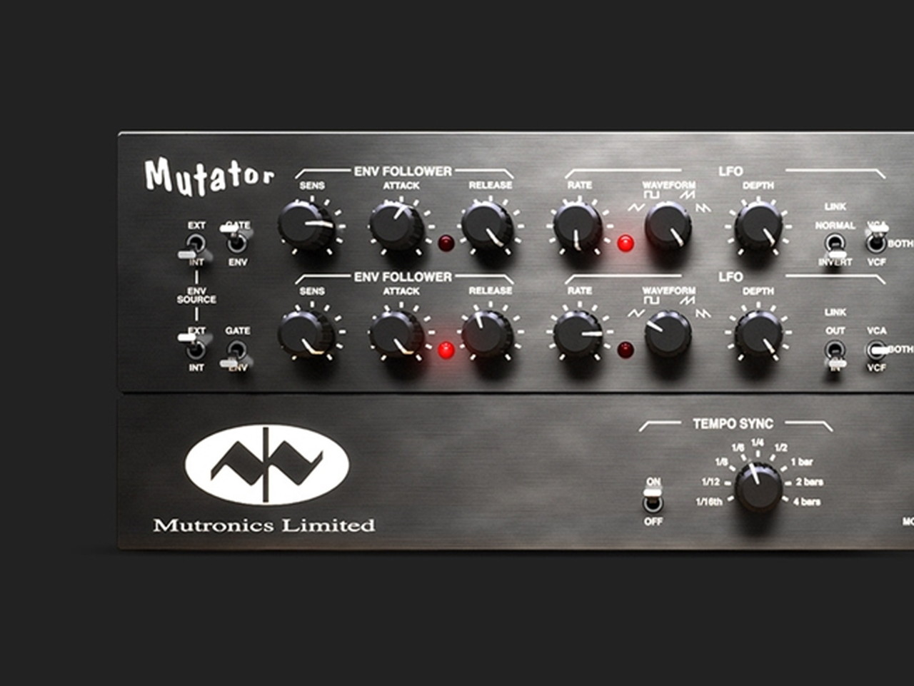 Mutatorの2つのチャンネルのそれぞれにはアナログのボルテージ・コントロール・フィルター(VCF)が備わっており、送り込まれたあらゆる音源にシンセのようなフィルター・スウィープを作成できるようになっています。フィルターは様々なソースから制御できます。例えばエンベロープ・フォロワーを使用すると、音源の振幅に比例してフィルターがスウィープします。ゲート・モードでは、フィルターをオンまたはオフにでき、搭載のLFOでも制御できます。LFOには4つの波形があり、音楽に合わせた、または音楽とは独立したフィルター・スウィープを作成できます。