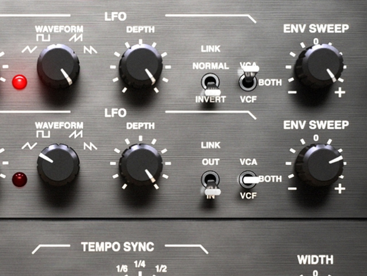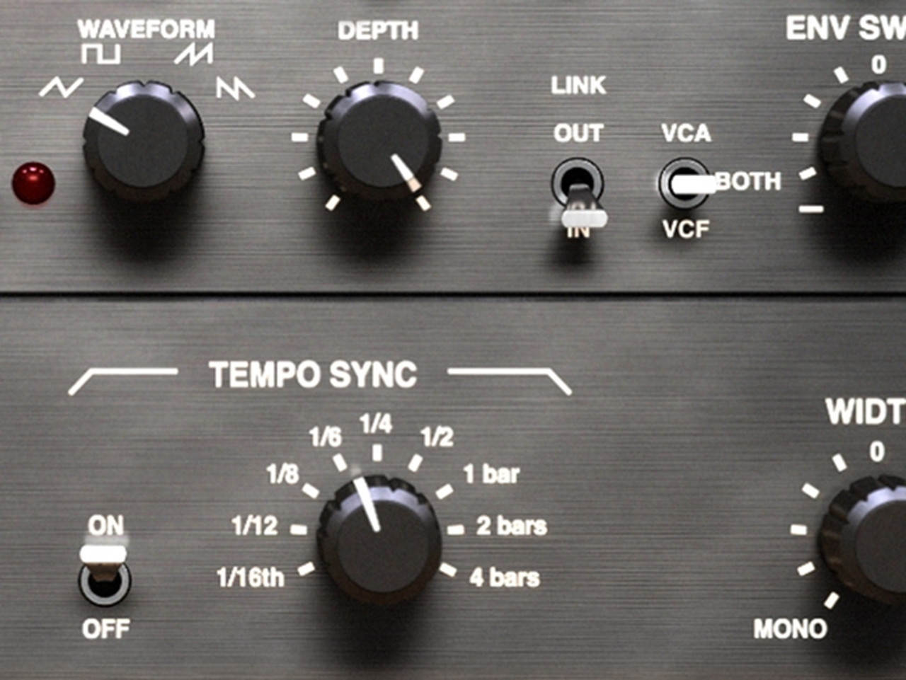 - 音源の振幅、LFOまたは外部音源でフィルター・スウィープを制御