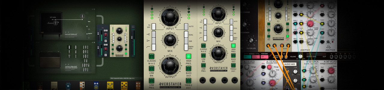 Overstayer M-A-Sには、Softubeのギター&ベース・プラットフォームAmp Room用のモジュールも収録されています。Amp Roomはプロフェッショナル・クオリティのギター/ベース・プラットフォームで、スタジオ・エフェクトやクラシック・アンプ、キャビネット、ペダルと組み合わせることで、そのままでスタジオ・クオリティのトーンが仕上がります。