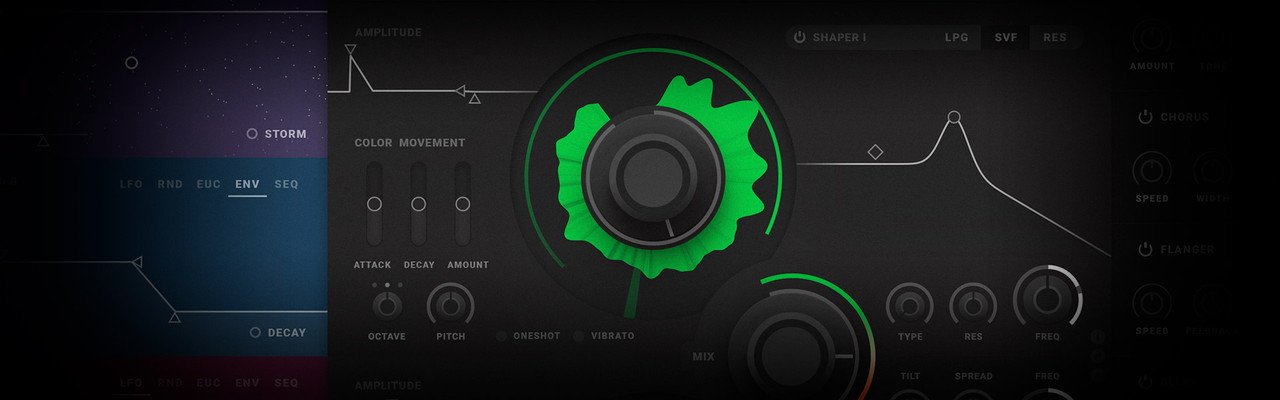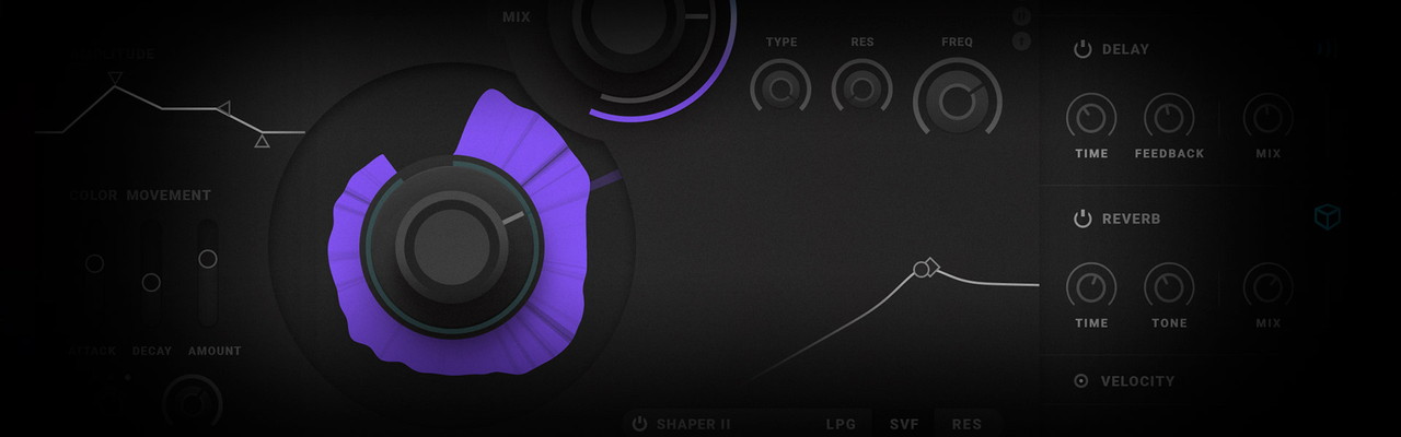 ソースはそれぞれに用意されたシェイパー・セクションへルートさせることができ、例えばステートバリアブル・フィルター(ローパス、ハイパスまたはバンドパス)、バクトロール式ローパス・ゲート、3つのレゾナント・ピークといった、Softubeがアナログ・モデリングした3種類のフィルターのいずれかを選択できます。