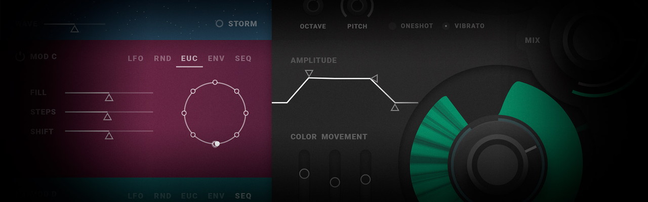 各ポッドには5種類のモジュレーター(LFO、ランダム、ユークリッド・シーケンサー、ステップ・シーケンサー、エンベロープ)が用意されており、ポッドを使用すればParallelsのほぼ全てのパラメーターをモジュレートでき、さらには選択したブレンド比で2つのポッドを組み合わせて、1つのパラメーターを同時にモジュレートすることも可能です。