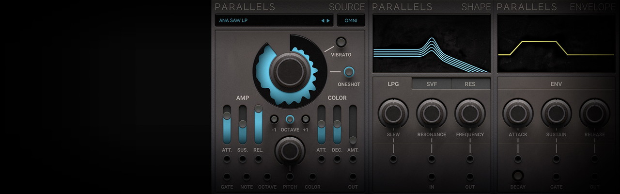 - Parallelsのソース、シェープ、モジュレーション、エンベロープ、FXセクションがSoftube Modularのモジュールとして使用可能