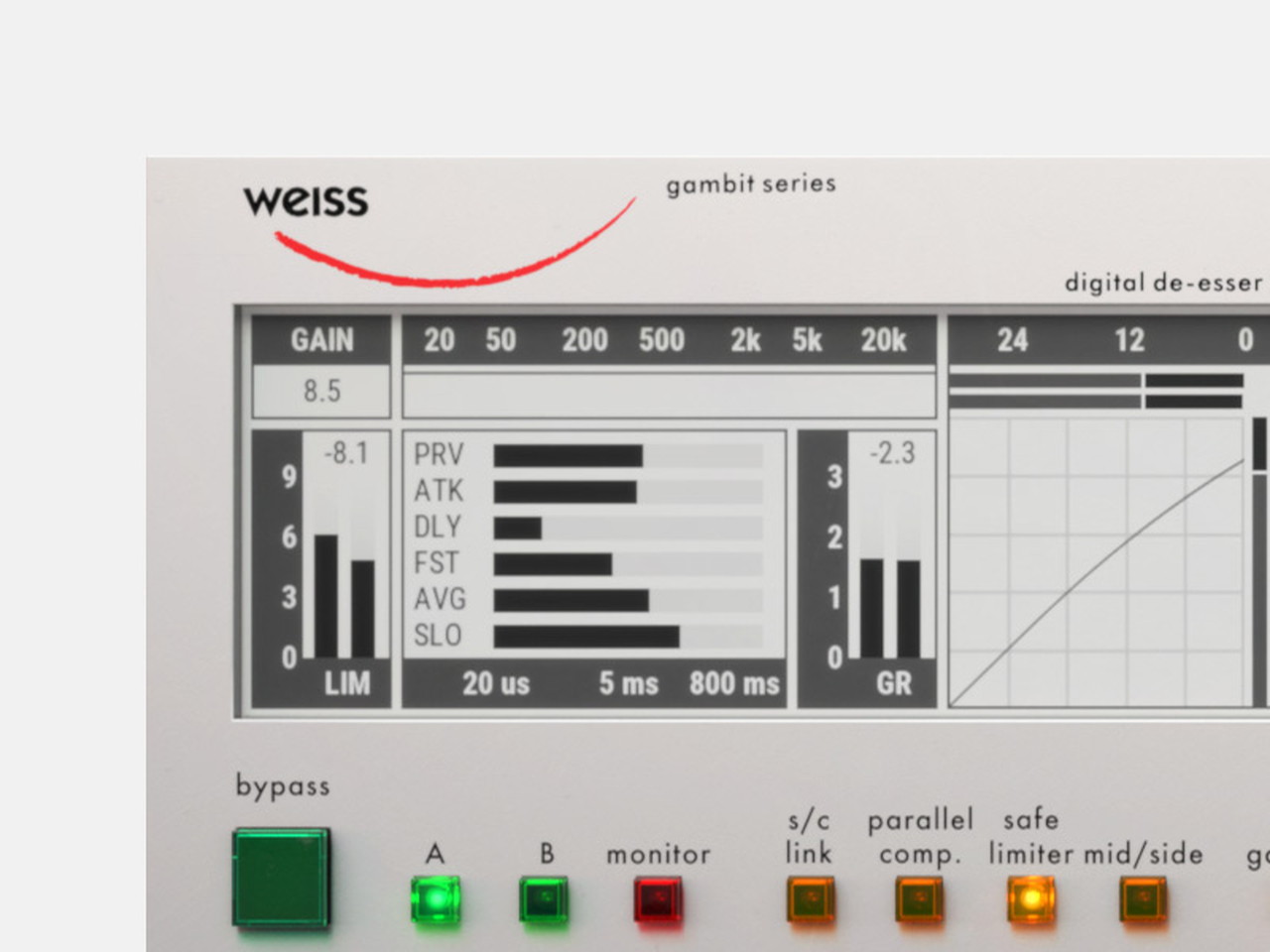 また、Weiss Compressor/LimiterをWeiss Deessと一緒にボーカルに使うと、目的の周波数帯に正確で詳細なダイナミック・プロセッシングを施すことができます。妥協は一切ありません。