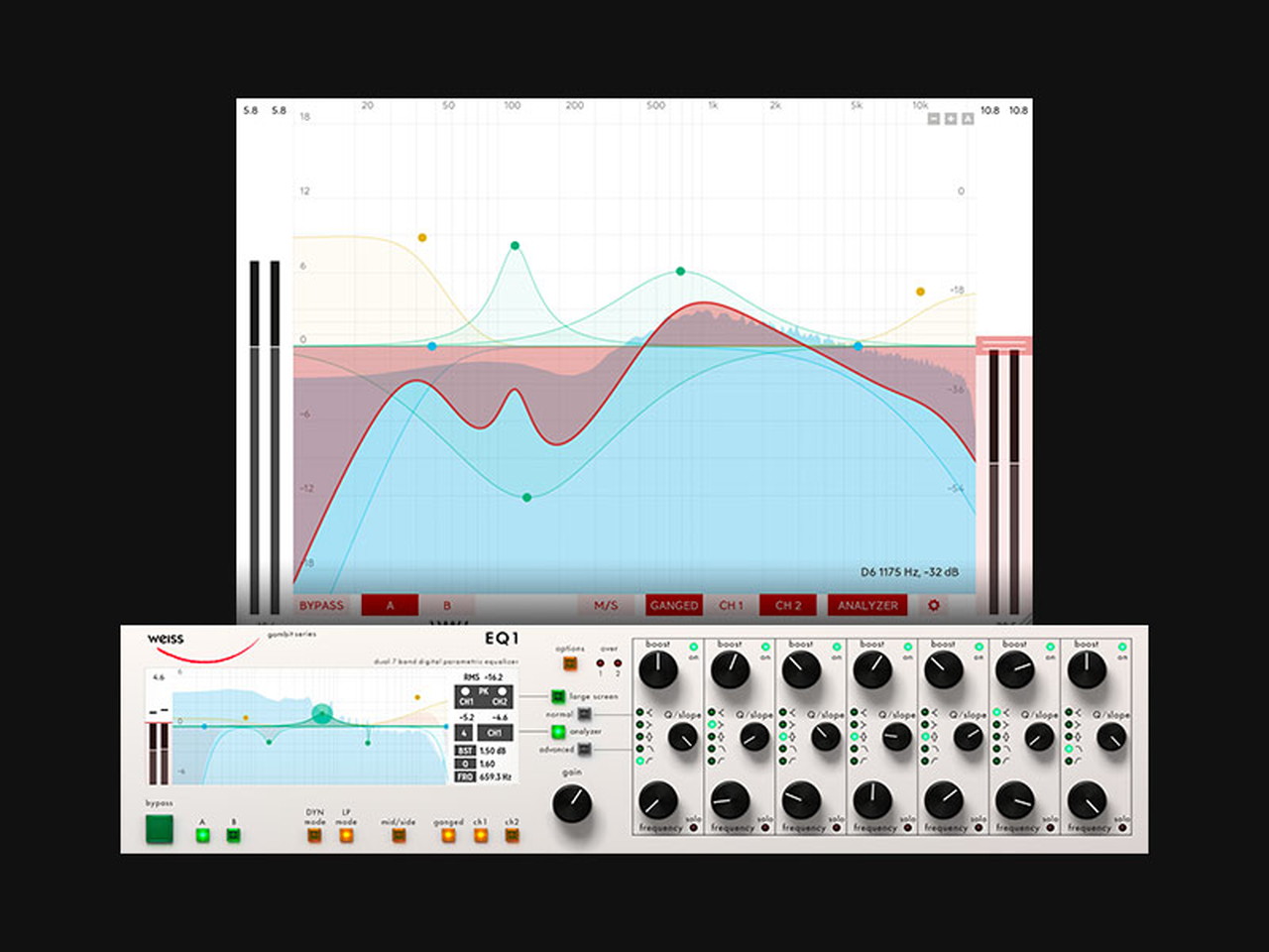 デュアル7バンドEQを備え、カット/ブースト範囲は-39~+18 dB、Q値は0.2~650、チャンネルのリンク/リンク解除やM/S処理、フィルター・スロープは0db、6db、12db、24db、48db、96dbまで拡張し、さらに大画面インターフェースやダーク・モードといった数々のアップグレードも実現しています。
