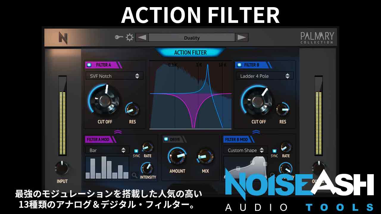 アクションフィルタは、直感的でシンプルなGUIの中で簡単に操作し、ユニークで非常に創造的なテクスチャを作成することができます。 Action Filterは、過酷で過飽和なエフェクトも、穏やかで滑らかなフィルターも作成できます。 トラックに深みや明るさを加えたり、サウンドを完全にカレンダーすることもできます。